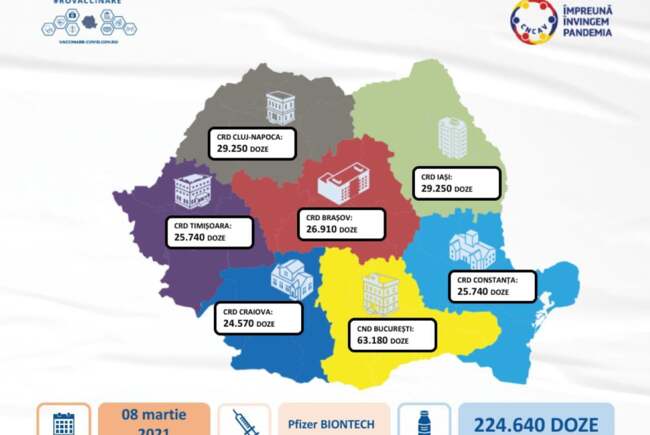 În 8 martie va sosi în România o nouă tranșă de vaccin de la Pfizer BioNTech, care constă în 224.640 doze. Deși autoritățile au promis un număr mai mare de doze de vaccin pentru Timișoara, care intră în carantină, va primi doar 25.740 de vaccinuri, în timp ce Cluj va avea 29.250, ca Iași.